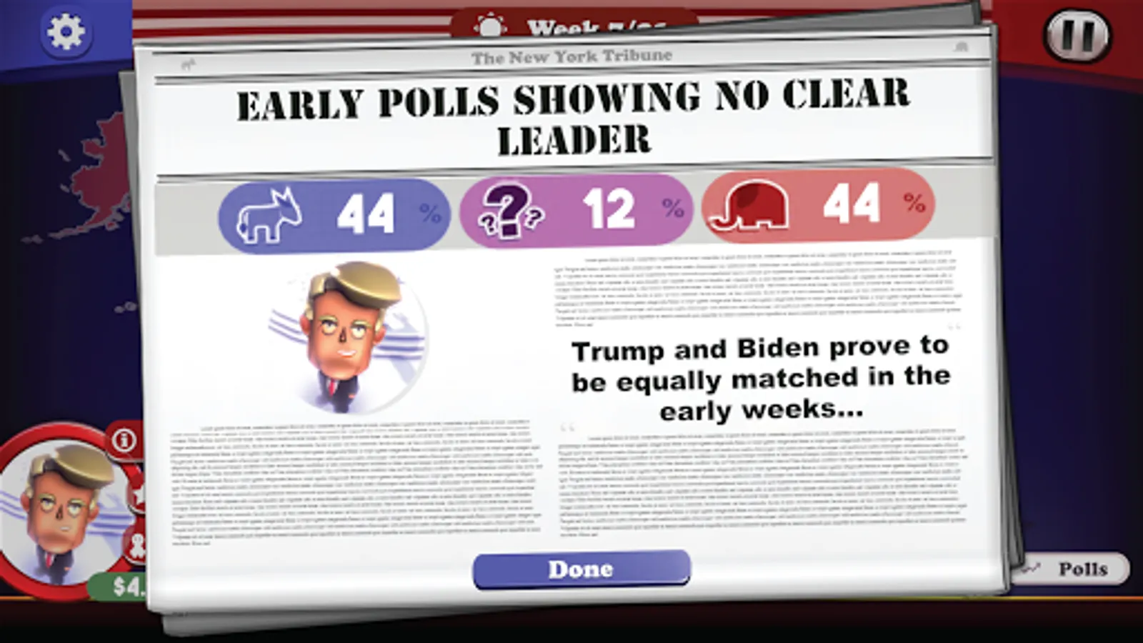* Choose your Candidate - Play as one of several candidates, each with their own custom stats like stamina, intelligence, charisma, media bias, and more.