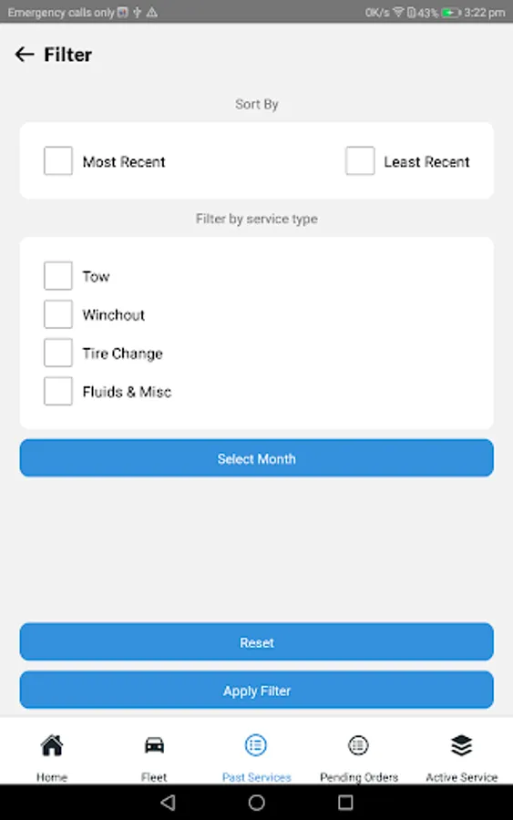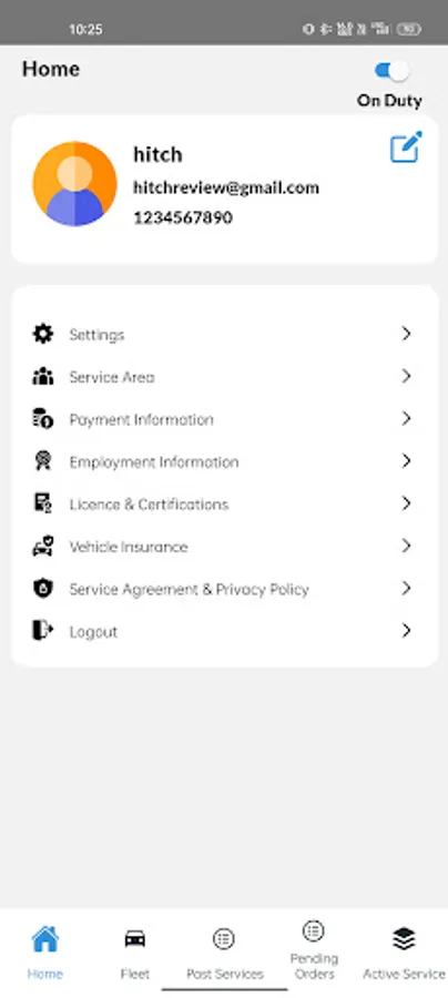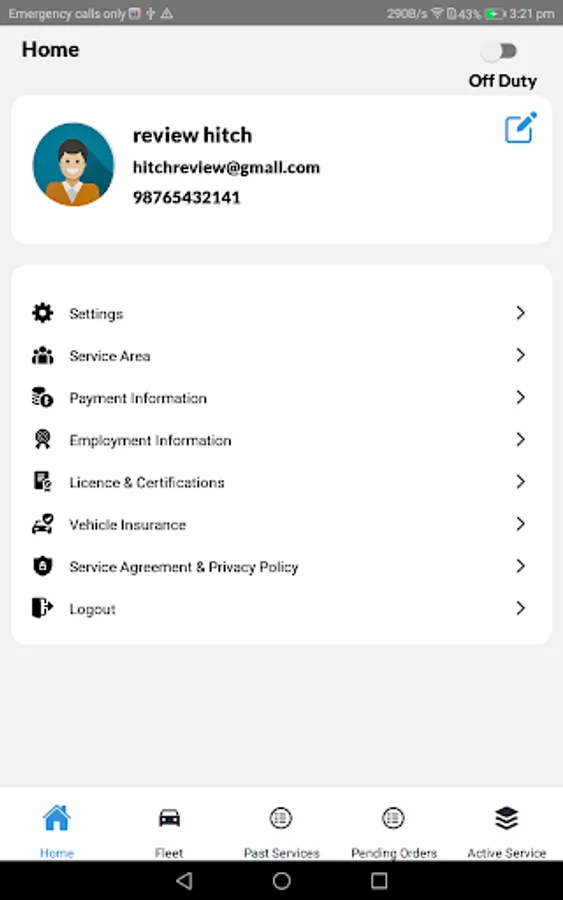 Add driver information, vehicle information, and change the service area you cover as needed. Select if you are on duty or off duty depending on if you’re ready to receive service requests or not.