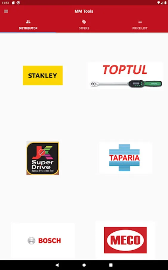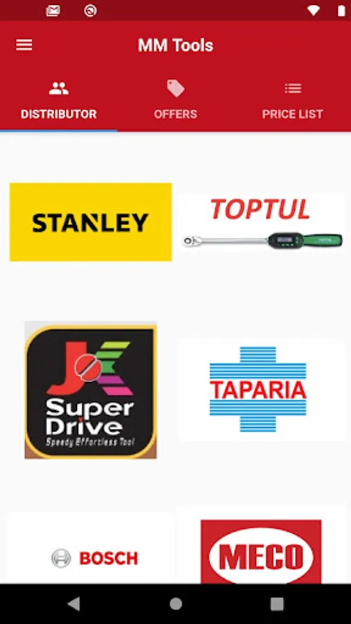 Dealers in Stanley,JK,Bosny,Bosch,Pidlite,Cromwell ,Schflier,Kristeel,DENEERS,Gallop ,In size,Toptul,Painter & Elephant jack,non sparking tools,Freeman tape and also largest Distributors of Taparia ,ITI ,Totem,Inder,MECO,KUSAM MECO ,Fluke,samrat,Halo tape & Die,Force,Honiton