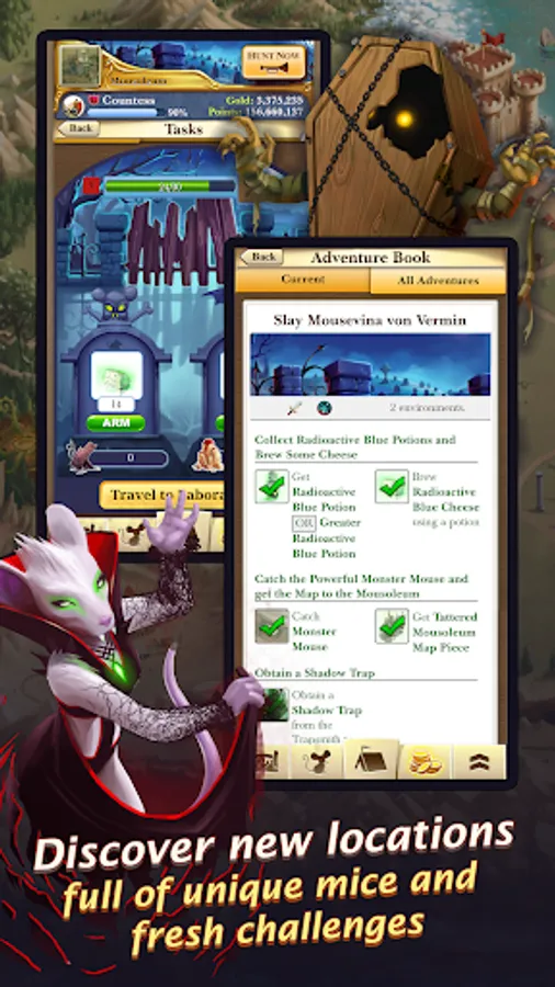 Mix and match your cheeses, weapons and bases to make a winning mouse-catching combination! Study the enemy, craft the perfect mousetrap, and set your bait! Maximize your trap power to catch rare and elusive mice while on adventures!