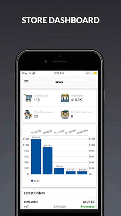 - See an overview of total orders, sales, customers, online customers, sales analytics and more.