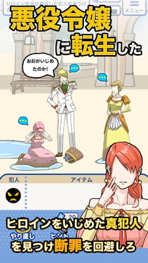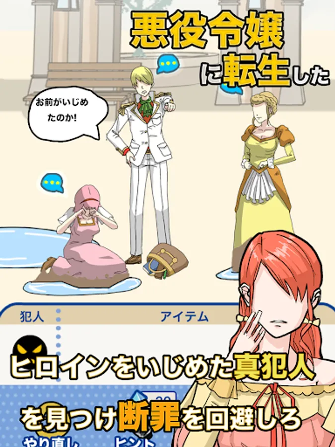 ・A mystery-solving and escape game in which a reincarnated villainess tries to solve the mystery of an incident that occurs according to the scenario of an otome game and avoid condemnation of my mother's prince. Can you find the real criminal hidden in the game?