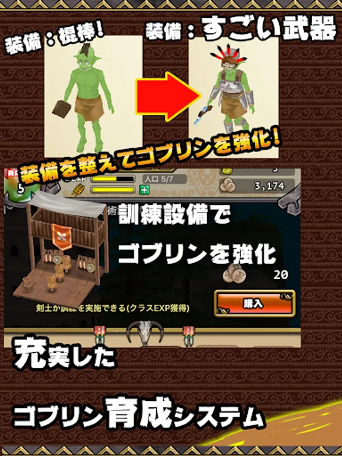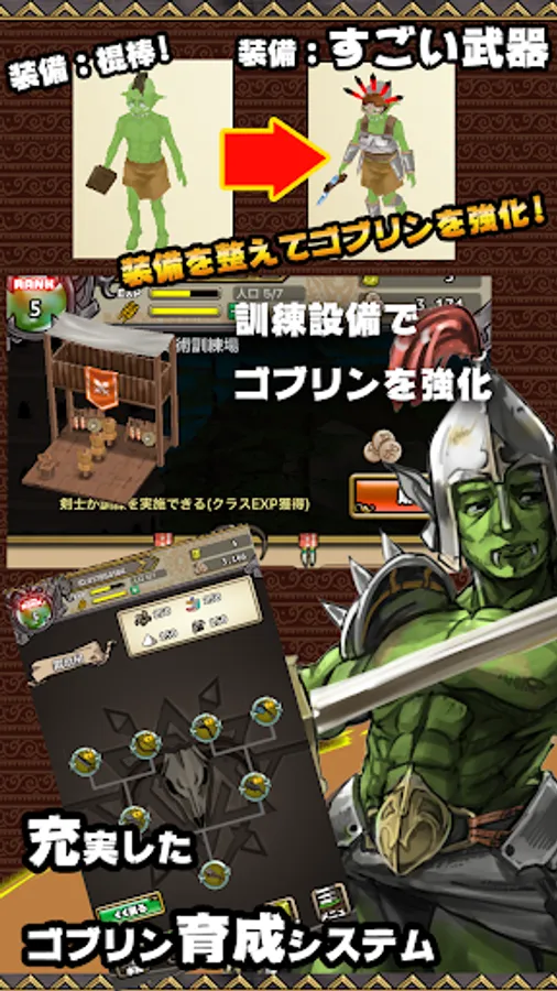 職業、装備、レベルアップ豊富なゴブリン強化システム。