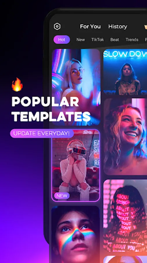 - Provide a full range of templates with different themes: Beat, Slowmo, Effects, TikTok, Ins, Animation, Lyrics, Love, MagicSky, etc. Different category of templates are trendy, well-designed and constantly updated. You can use these templates to make photo videos or short videos with magical effects.