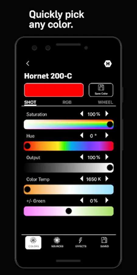 Hive Lighting's Antenna App allows you to adjust the Saturation, Hue, Output, and color Temperature of any C-Series fixture to create the perfect lighting for any shot.