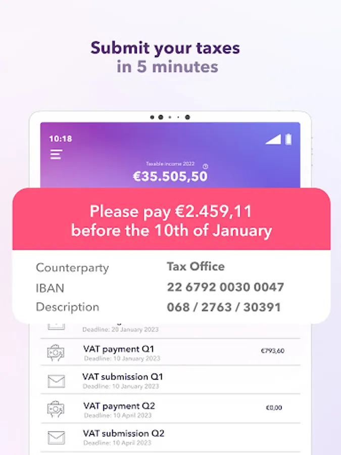 - Prepare and submit all your tax obligations, stress-free. No prior tax knowledge is required. From VAT return to income tax: we got you covered. We send you reminders for every tax deadline.