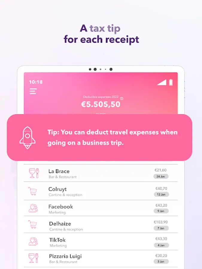 - Never lose a deductible expense again –just scan your receipt and we make sure it gets deducted from your taxes. For each receipt you scan, you get tailored tax tips. The app safely encodes your receipts and matches them with the relevant bank transaction. Accounting was never this easy.