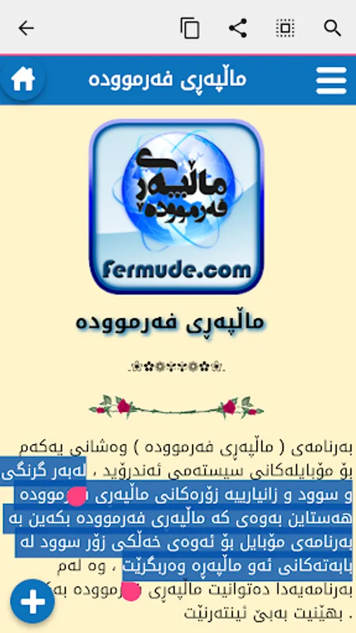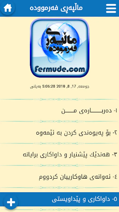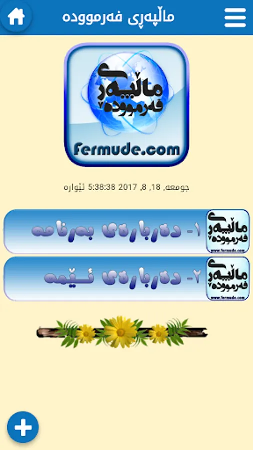 بەرنامەی ( ماڵپەڕی فەرموودە ) وەشانی یەكەم بۆ مۆبایلەكانی سیستەمی ئەندرۆید ، لەبەر گرنگی و سوود و زانیارییە زۆرەكانی ماڵپەڕی فەرموودە هەستاین بەوەی كە ماڵپەڕی فەرموودە بكەین بە بەرنامەی مۆبایل بۆ ئەوەی خەڵكی زۆر سوود لە بابەتەكانی ئەو ماڵپەڕە وەربگرێت ، وە لەم بەرنامەیەدا دەتوانیت ماڵپەڕی فەرموودە بەكار بهێنیت بەبێ ئینتەرنێت .