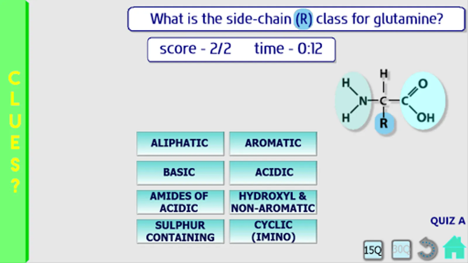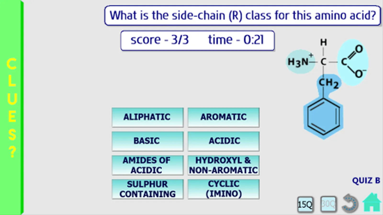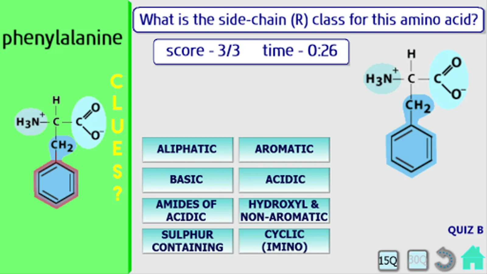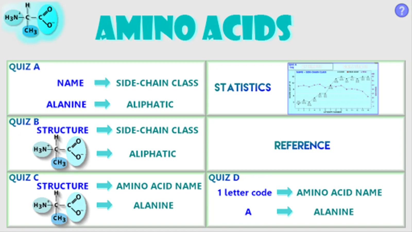 This amino acid app for biochemistry will help you to memorize the 20 most common amino acids, their structure, side chain class, 1 letter code and other properties. It is based on the reflective practice method of learning where reading (using flash cards) and recall (using quick quizzes) is combined. Your results are saved, plotted and analyzed so you can track your progress over time.