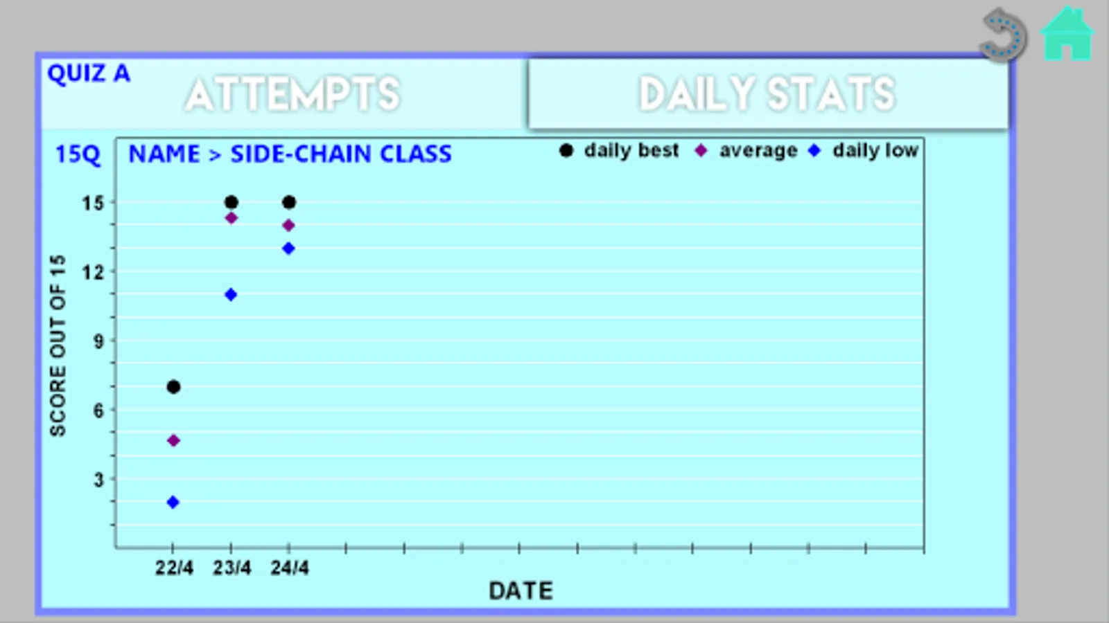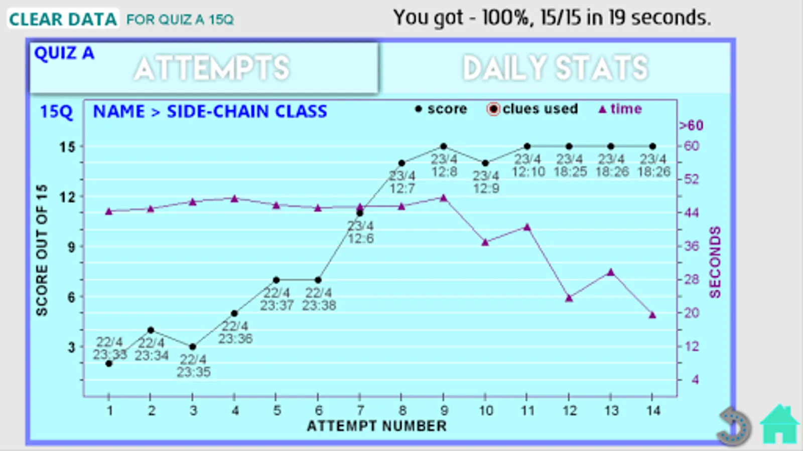 7. Your results for up to 42 x 8 quiz attempts are saved and can be retrieved at any time. Scores are plotted on line and bar graphs, together with time taken, if clues are used, time, date and daily: average; high; and low. Monitor your progress in memorizing amino acids over days, weeks or months.
