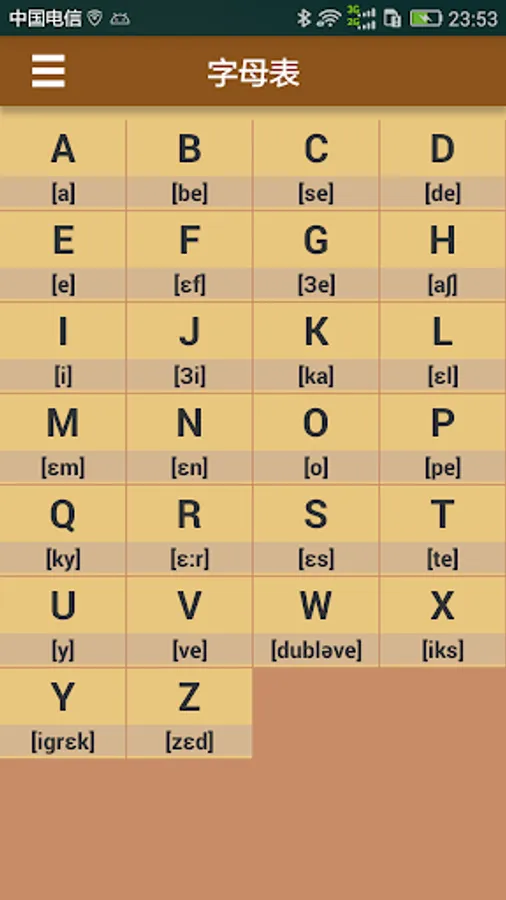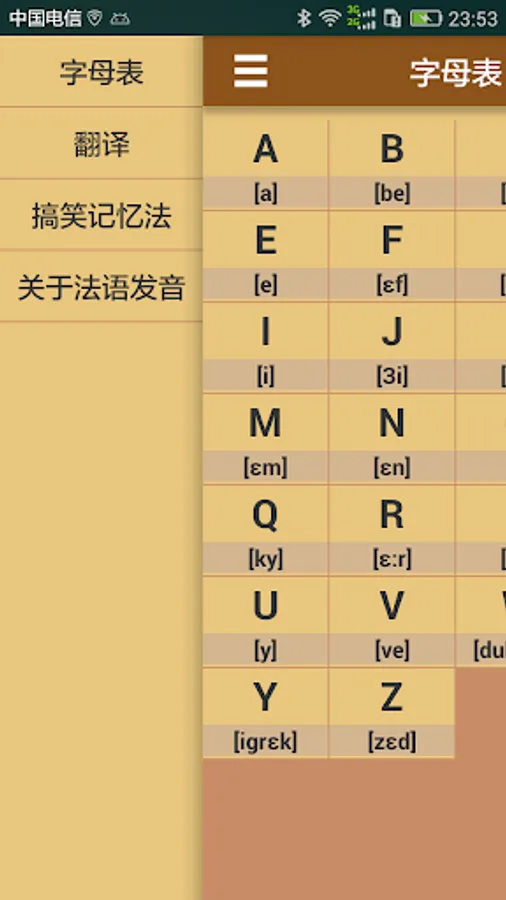 The pronunciation of French letters is a relatively important part of French learning. It is also an introductory study of French. This application allows users to learn French at any time by displaying the writing and pronunciation of French letters. The first stop in French learning helps you quickly master the pronunciation and writing of French and lay the foundation for future French learning.