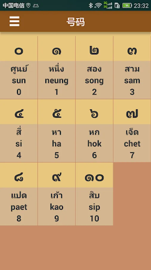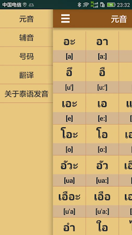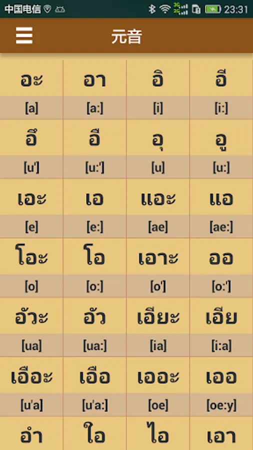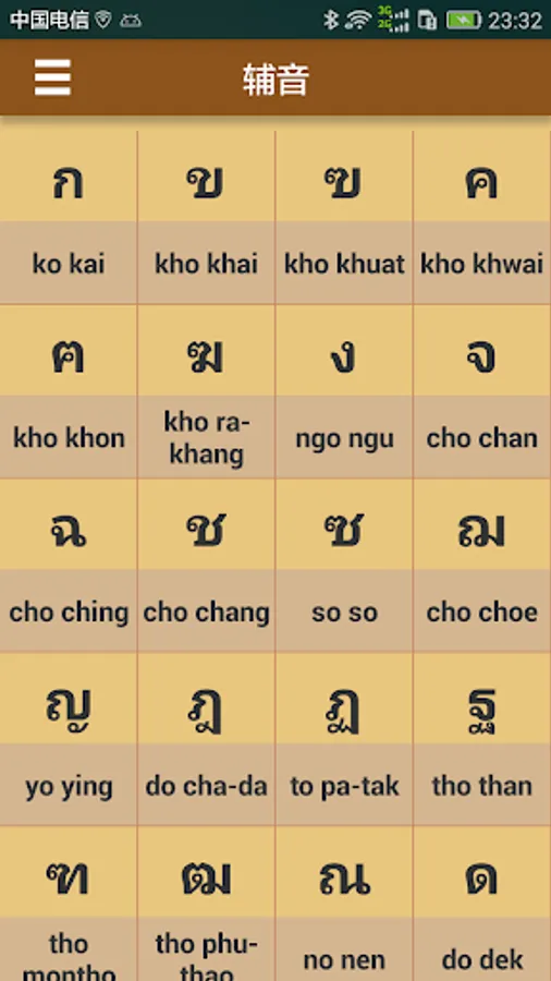 The pronunciation of Thai letters is a relatively important part of Thai language learning. It is also an introductory study in Thai. This application allows users to learn Thai at any time by displaying the Thai alphabet's writing and pronunciation (including yuan, consonants, and numbers). The first stop of Thai language learning will help you quickly master the pronunciation and writing of Thai language and lay a solid foundation for future Thai learning.