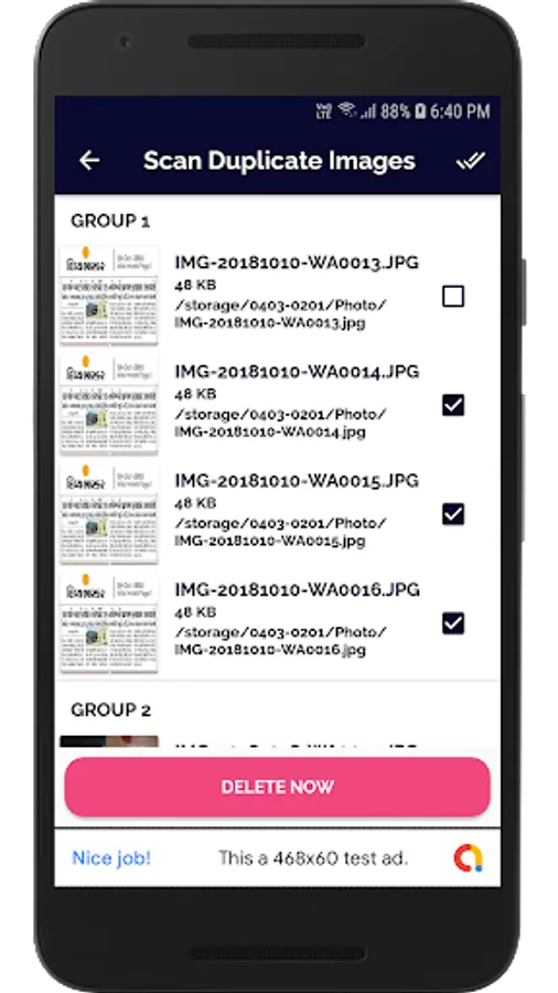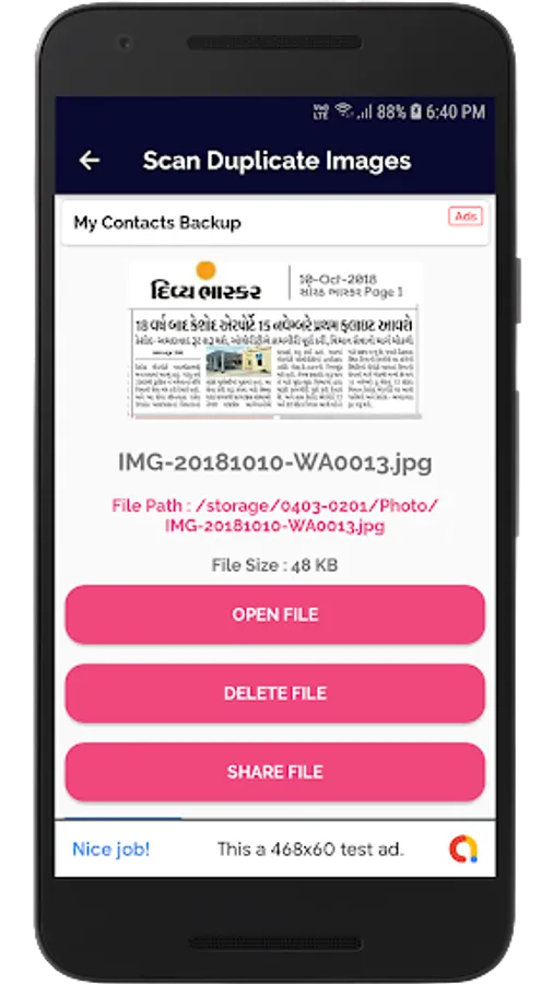 vi) One touch to clean duplicate files : Once application find the duplicate file you will have option to select which file you want to clean and after that in only one touch you can free and optimize your phone from all loads of useless memory storage.