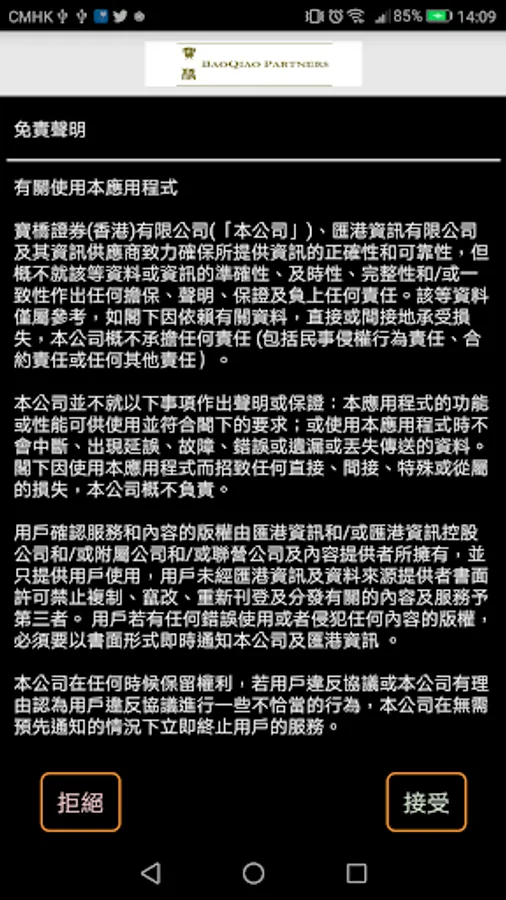 Clients who have registered the BaoQiao Partners Securities (HK) Limited Online Trading System (http://www.bqsec.com.hk) can access the Mobile Trading System with the existing “Login ID” and the “Password”.