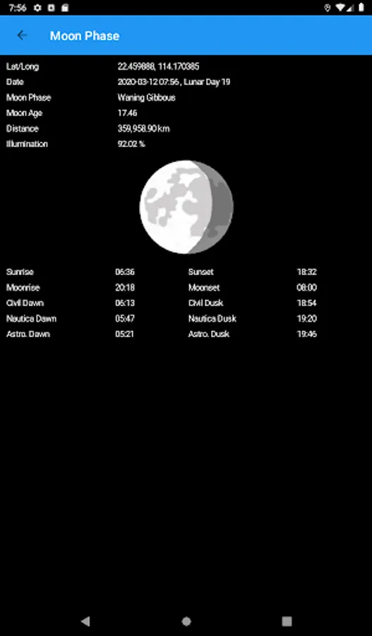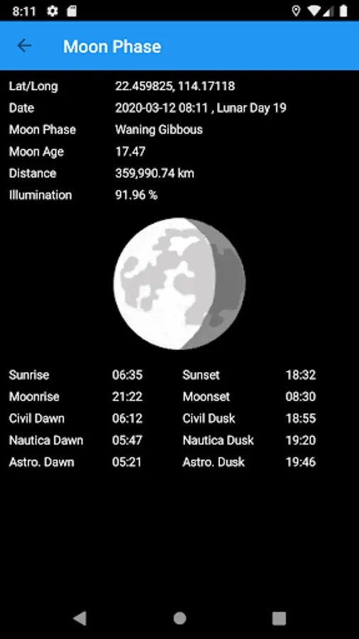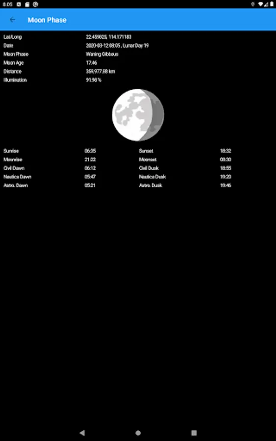4) moon phase, sunrise/sunset, moonrise/moonset information