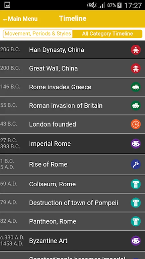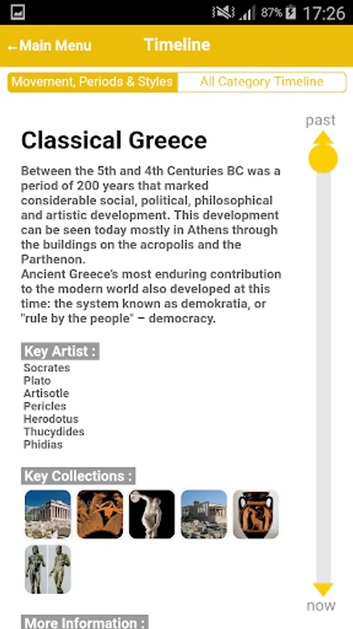 - Timeline – offers a chronological survey, letting you to scroll quickly through the centuries of history for context and reference of key moments in global history and in art, with direct links back to the Movements and Styles