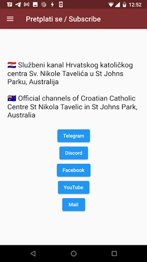 Ability to see all the official channels of St Nikola Tavelic in St Johns Park, Australia including Telegram, Discord, YouTube, FaceBook and Email.