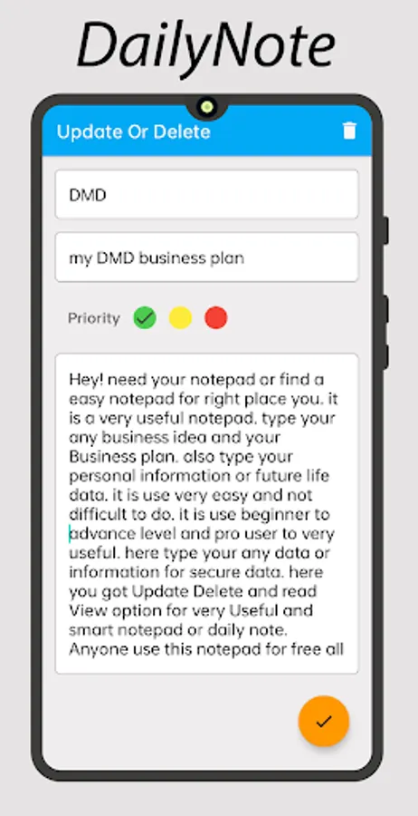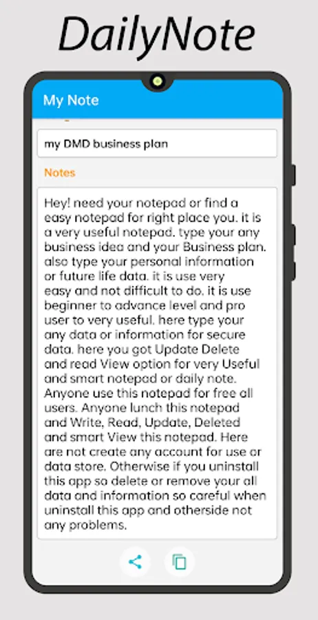 It is use very easy and not difficult to do. it is use beginner to advance level and pro user to very useful. here type your any data or information for secure data. here you got Update Delete and read View option for very Useful and smart notepad or daily note.