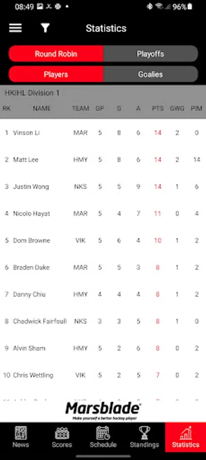 Full player and goalie statistics for both the round robin and playoffs