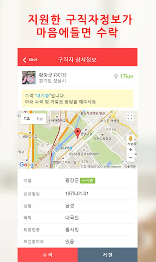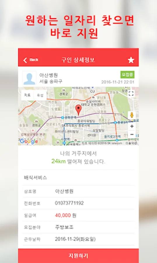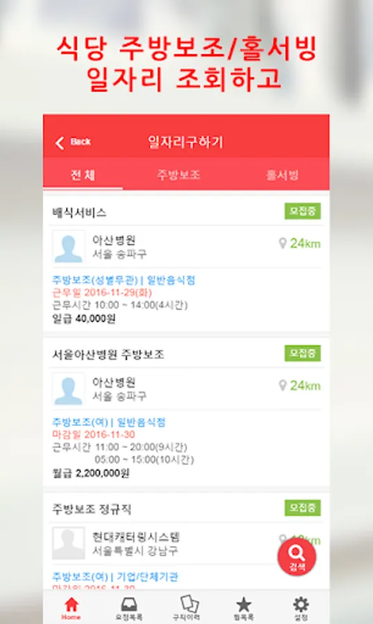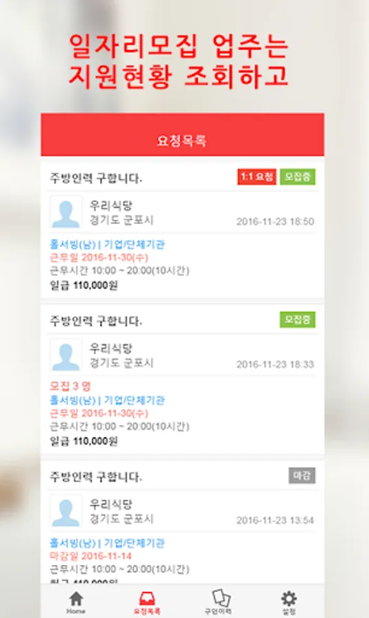2."모집하기"를 통해 구인정보등록하면 자동 매칭을 통해 구직자에게 알림푸시전송