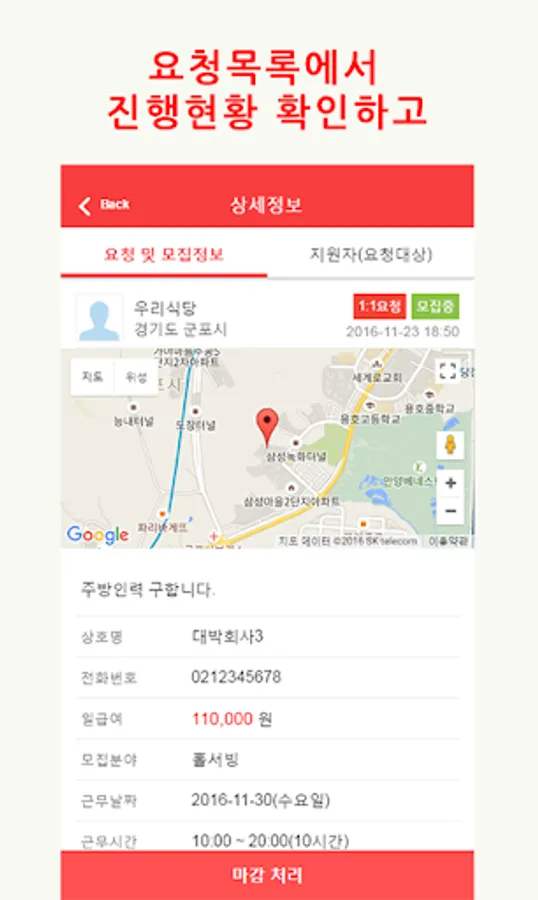 2."구인정보" 조회 및 일자리지원 또는 "1:1일요청"이 가면 요청정보 확인