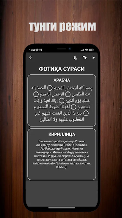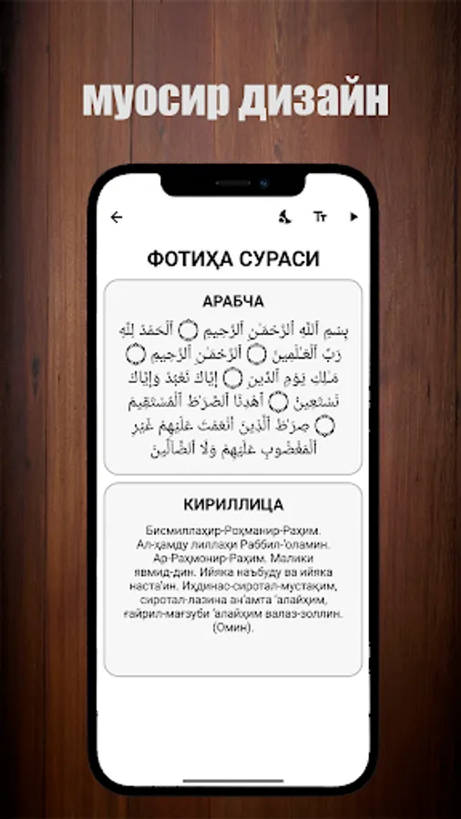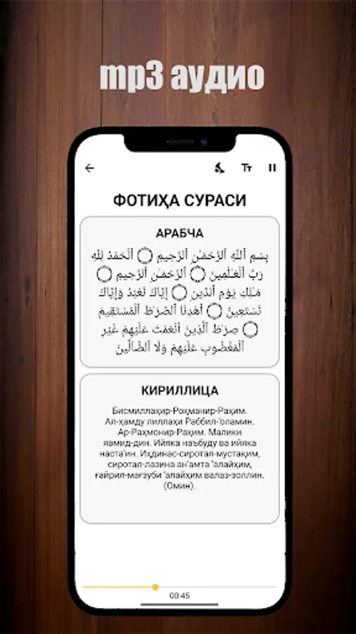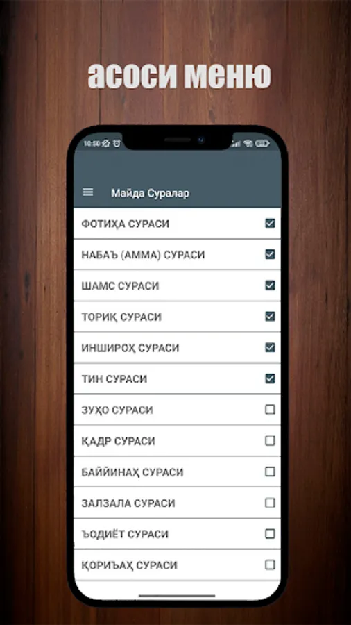 Fotiha, Nose, Falak, Ikhlos, Lahab, Nasr, Kofirun, Kavsar, Moun, Quraish, Fil, Humaza, Asr, Takosur, Koriah, Odiyot, Zilzila, Bayyina, Qadr, Tin, Inshiroh, Zuho, Lail, Shams, Toriq, amma. Oyat Al-kursi.
