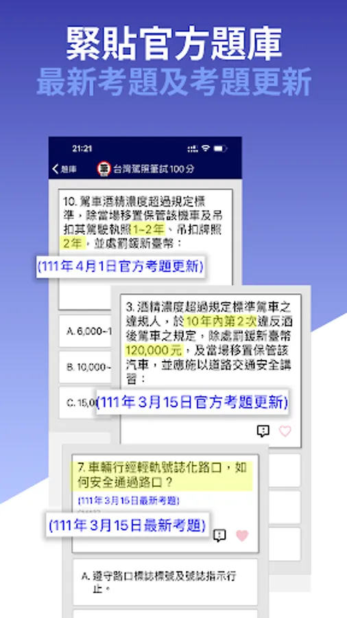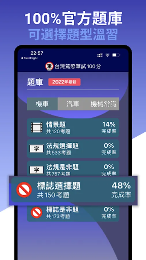 The "Taiwan Driver's License Written Test 100 Points" application is made with reference to the written test question bank of the "General Administration of Highways, Ministry of Communications of the Republic of China", including the motorcycle driver's license question bank, the car driver's license question bank, the professional small car mechanical general knowledge written test question bank, and the question bank that will be launched on July 1, 2022. The written test question bank of professional large-scale vehicle mechanics is convenient for candidates to practice anytime and anywhere when preparing for the driver's license test, and successfully pass the written test for locomotive driver's license and car driver's license.