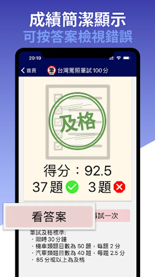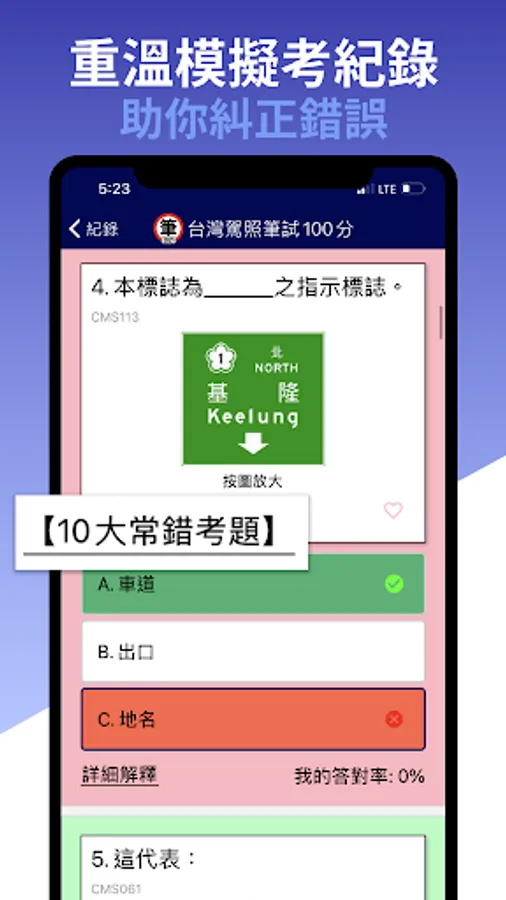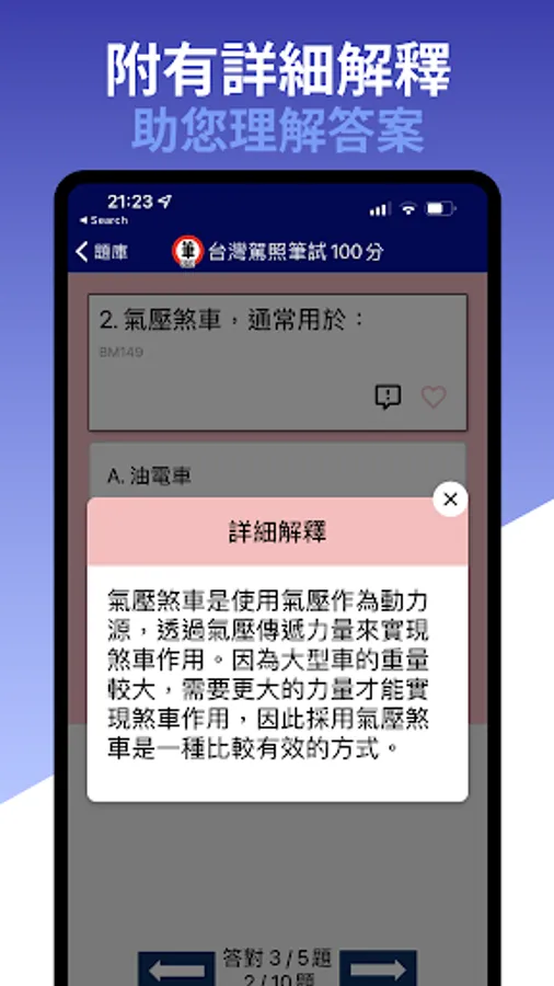 The questions of the simulated written test are distributed in proportion (true or false questions, multiple choice questions, sign questions, and legal questions), and the questions are randomly selected, so that you can familiarize yourself with the mode of the written test and complete it within the time limit. Immediately after completing the written test, the results are displayed, and the user can focus on checking the wrong test questions, helping to understand weaknesses and strengthen review.