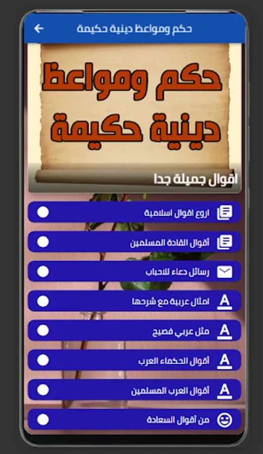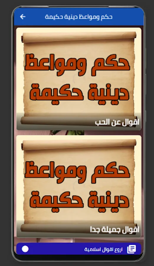 "Wise Religious Judgment and Sermons" is a wonderful application that contains a large collection of wise religious wisdom and sermons aimed at strengthening faith and promoting spirituality. The application contains a large collection of religious wisdom and proverbs that aim to consolidate basic Islamic values in the souls. It also contains a set of religious tips and guidance that help to approach God Almighty and live in peace and piety.