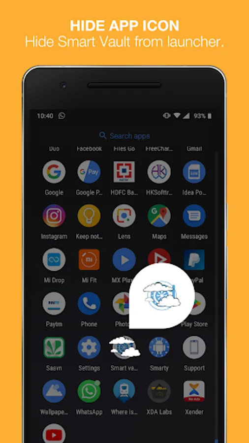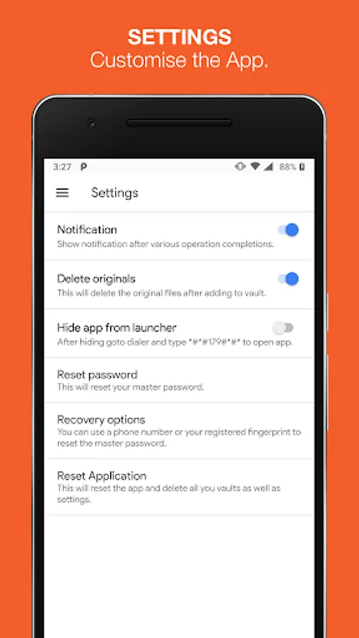☆ Hide app icon: Make Smart vault icon disappear from your home screen and it can only be found again with using dialer app on your phone.