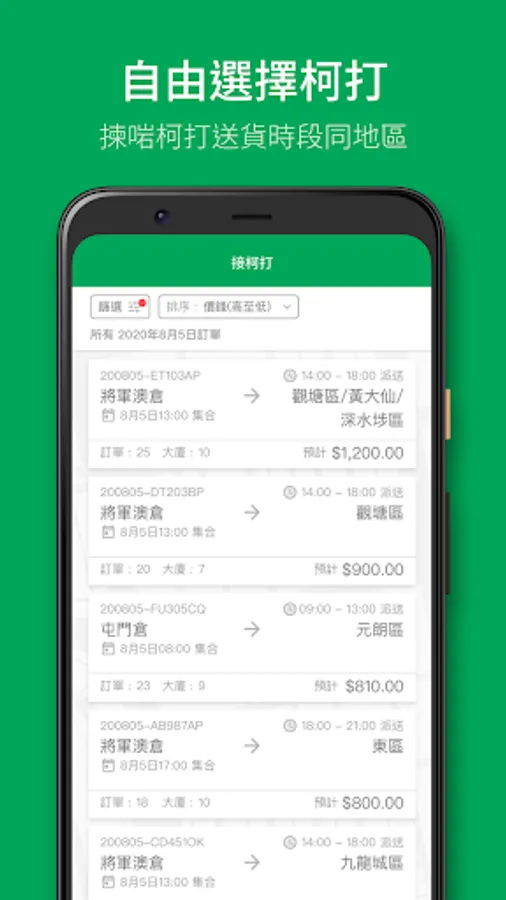 Earn more money by picking up orders and delivering goods to HKTVmall customers with your own vehicles. Pick your desired delivery timeslots and districts that best fit your schedule from our daily high-volume orders, and keep track of your earnings anytime with our APP.