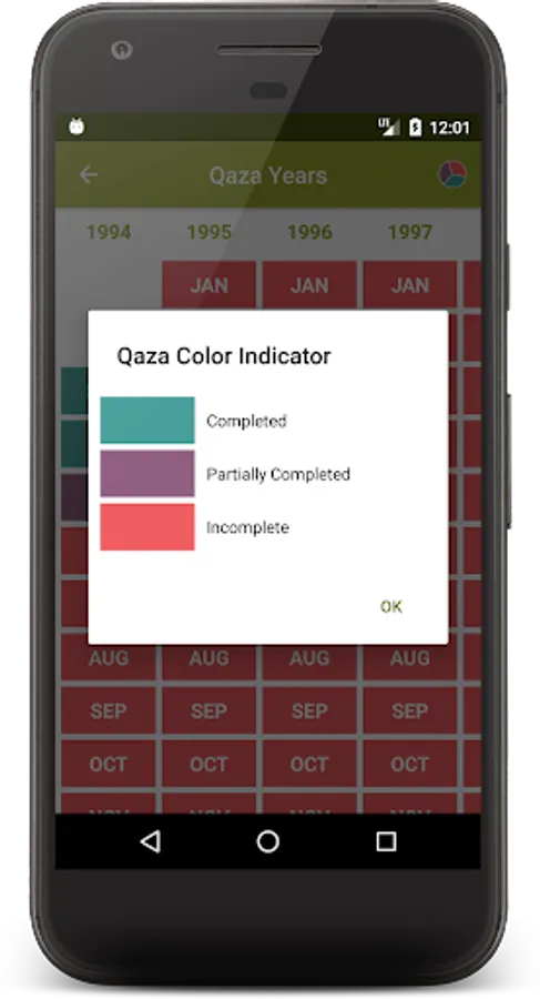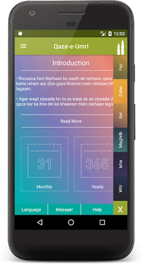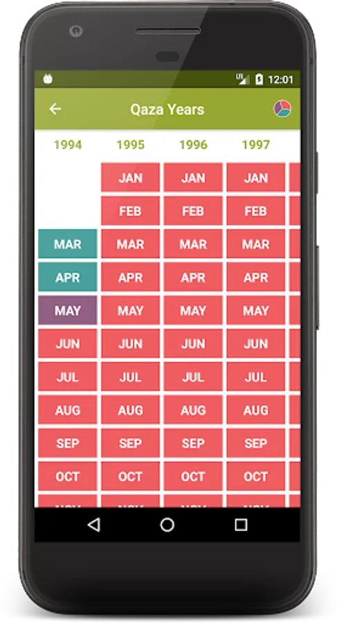 Users can use the app to check their monthly status and yearly status quickly from home screen. The color indicator shows the yearly status of each month where Qaza prayer is pending.