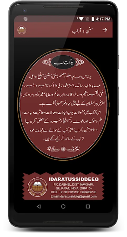 The app is based on the book "Sunan Wa Aadaab" compiled by Hazrat mawlana Mufti Abu bakar Patni Sahab (D.B). These etiquettes should be followed for various activities that we perform in our everyday functions of life.