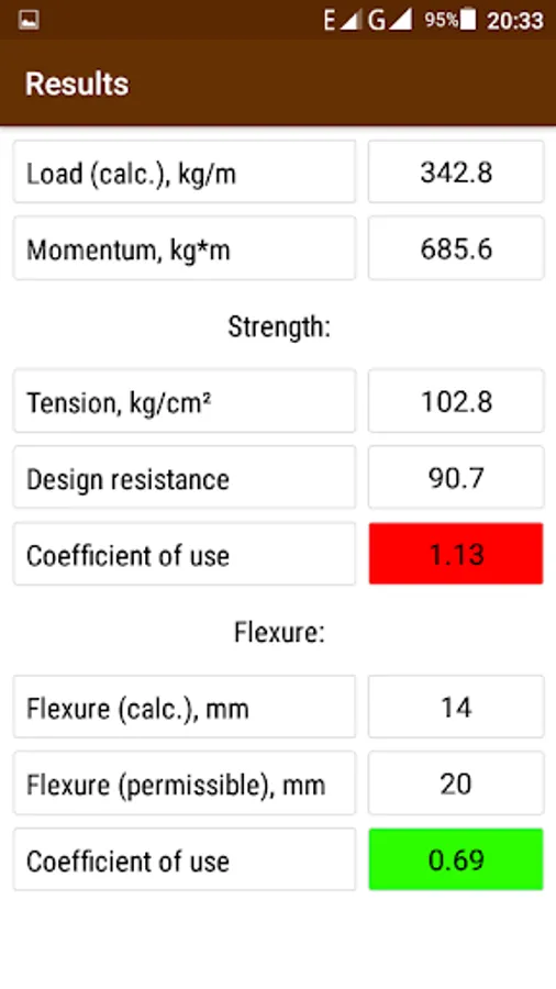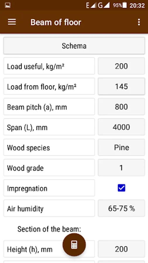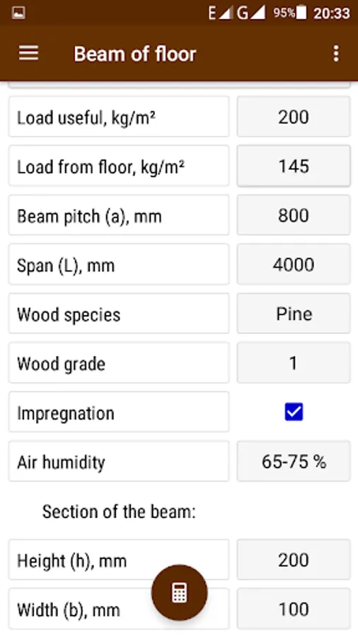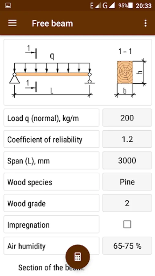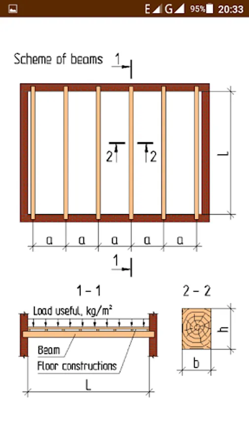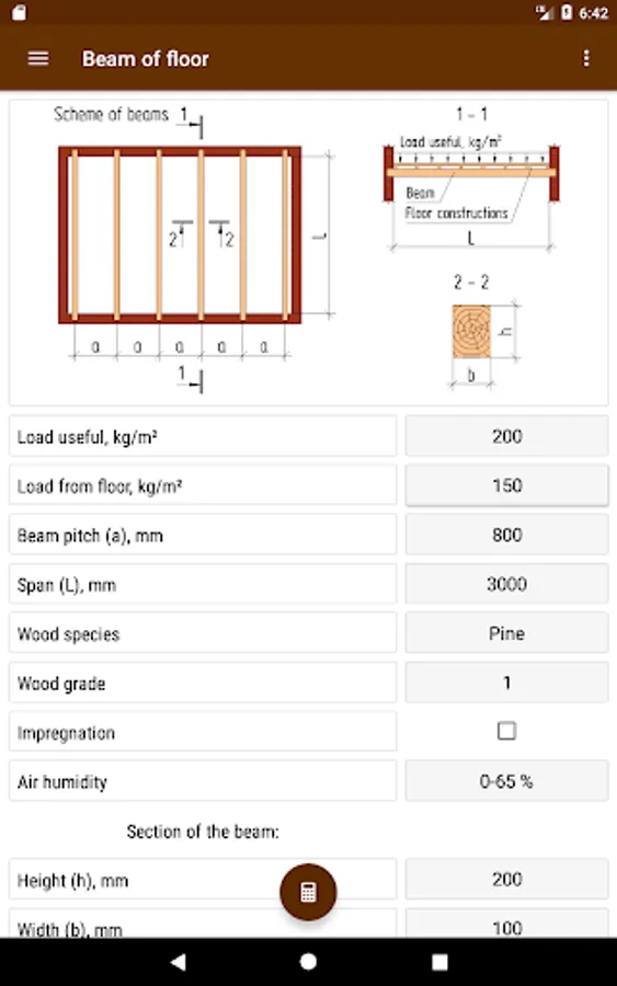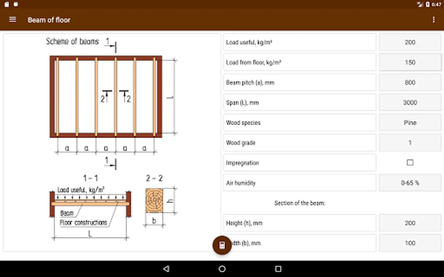 The application calculates the wooden beams of the floor or the covering for strength and deflection according to building codes and norms (SP 64.13330.2011).