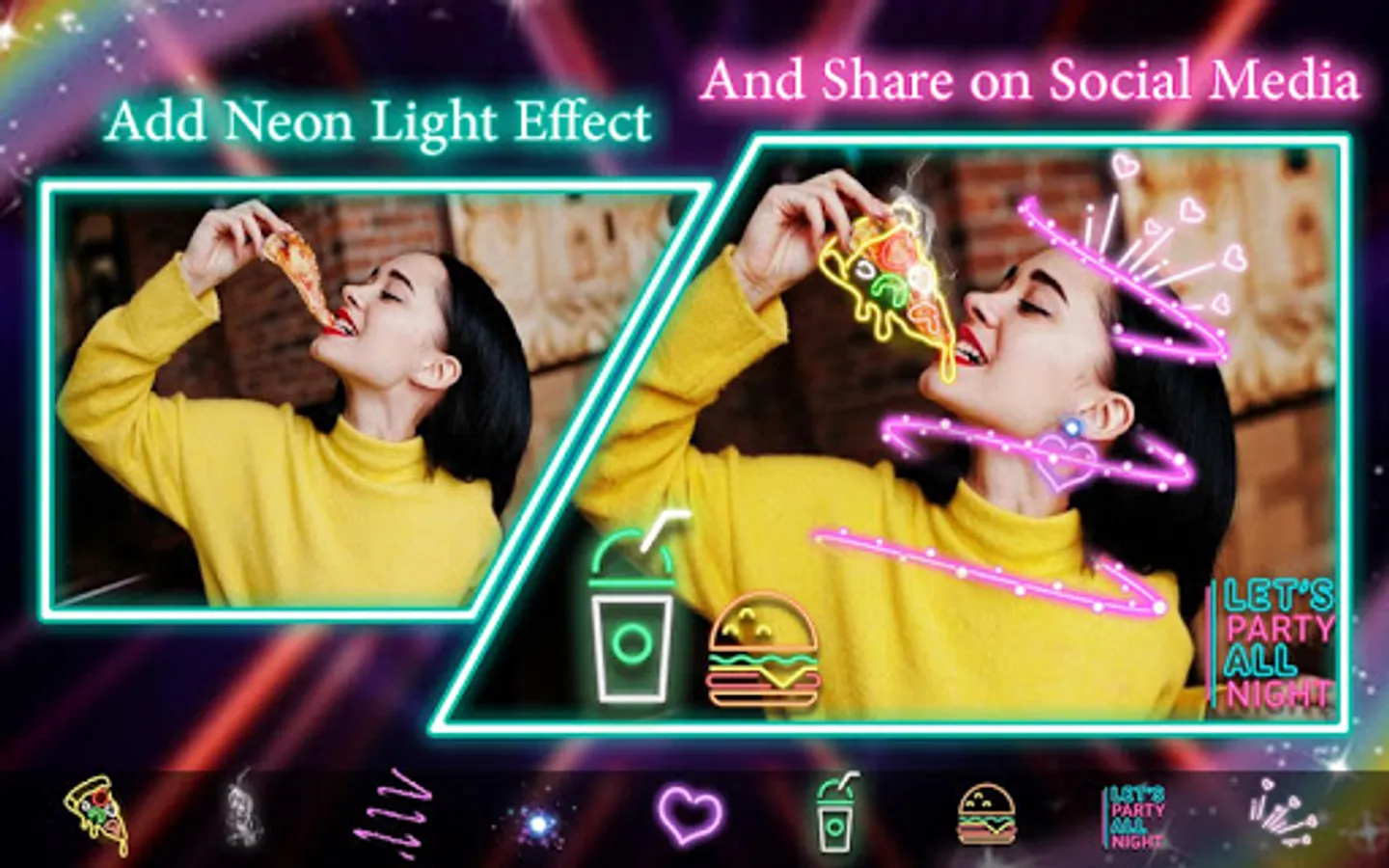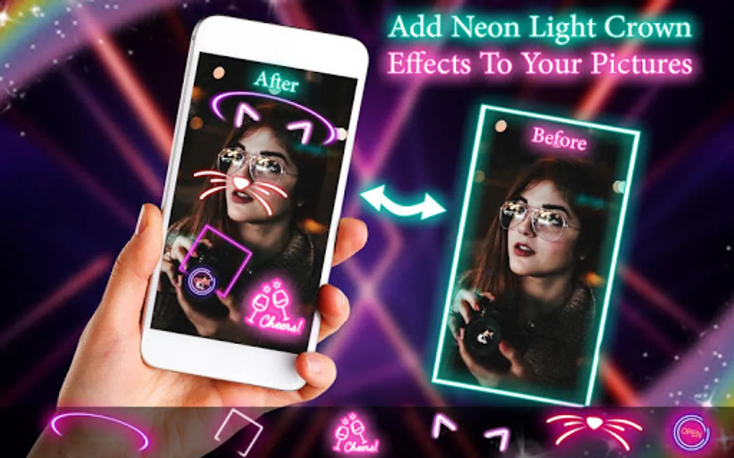 This photo software neon photo editor effects for pictures can improve your photo editing skills. This glow picture editor is perfect for people who love glory photo editor. Download neon photo editor light effects for pictures to edit images with the neon shape photo editor. Pick the glowing colours such as neon yellow, green, pink, and more elegant pictures edit.