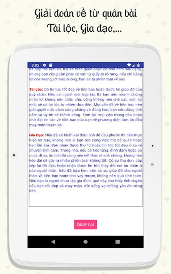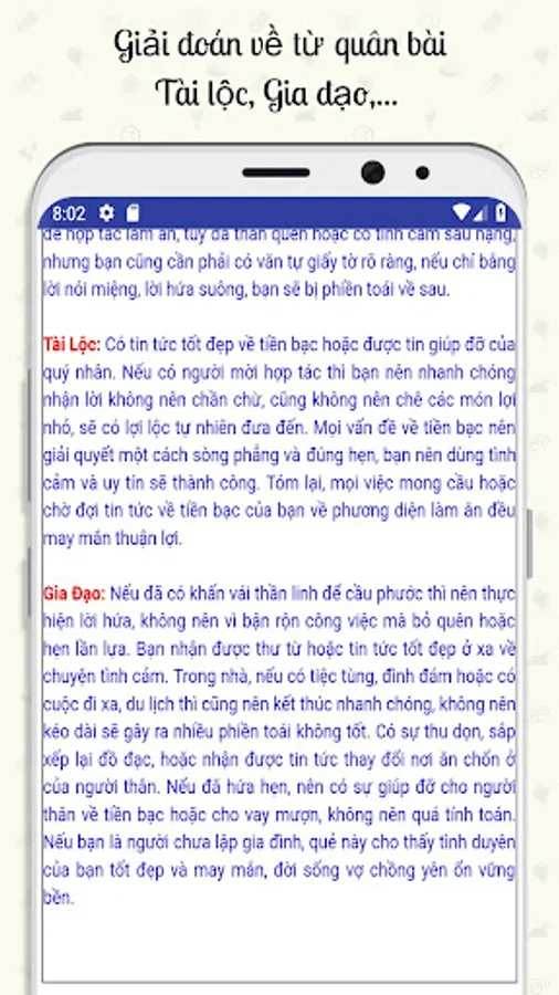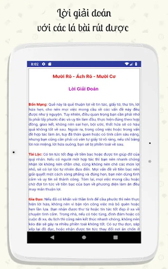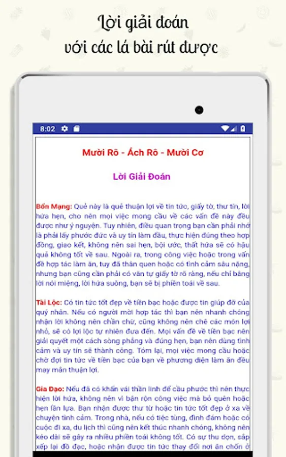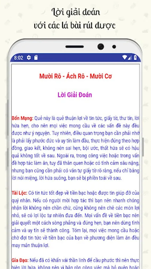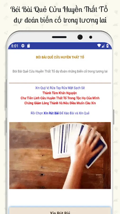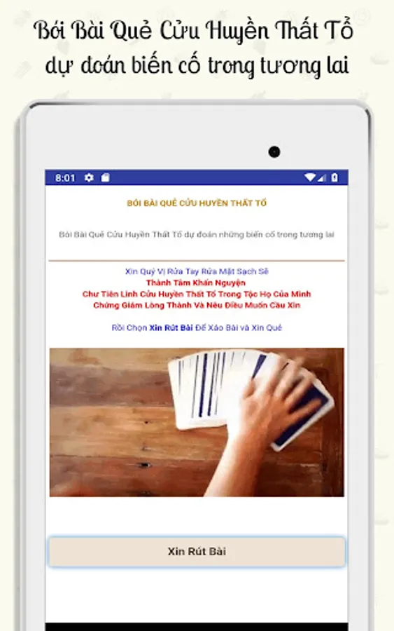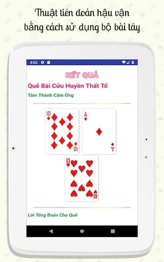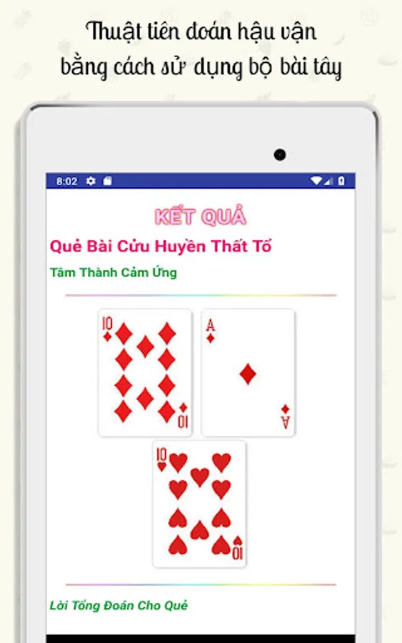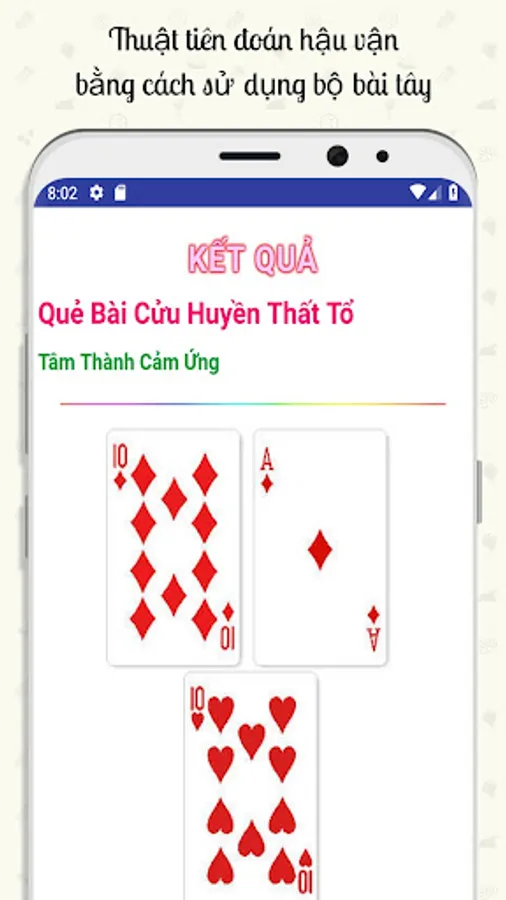 Our Cuu Huyen That To Divination application will use 32 cards in a 52-card deck from 7 - A to predict human destiny. Each card has a mystical meaning, with 3 random cards that will give you the most accurate information and solve a hexagram about future events you will encounter.