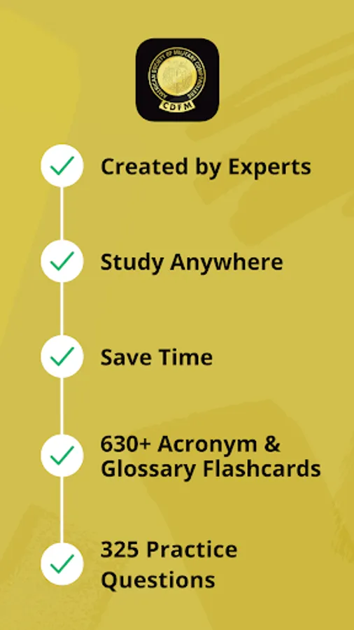 Take your studies on the go and prepare from anywhere! The CDFM Practice Test app offers supplemental exam-prep content at a fraction of the price, plus hundreds of virtual flashcards. It includes everything you need to prepare from anywhere to earn your CDFM.