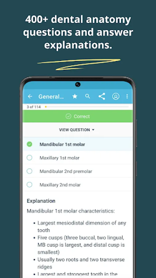 “Dental anatomy Mastery was a lifesaver in dental school. The best part are the detailed explanations that give you a better understanding of the answers.. It's so valuable, I still use it as a learning tool now that I’m a dentist!”