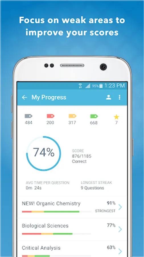 Pre Medical Mastery is a premium-quality study tool that many students have used to maximize their MCAT scoring potential. Premed Mastery tracks your progress to tell you where your knowledge is strong and where you need to improve so you can better focus your study time.