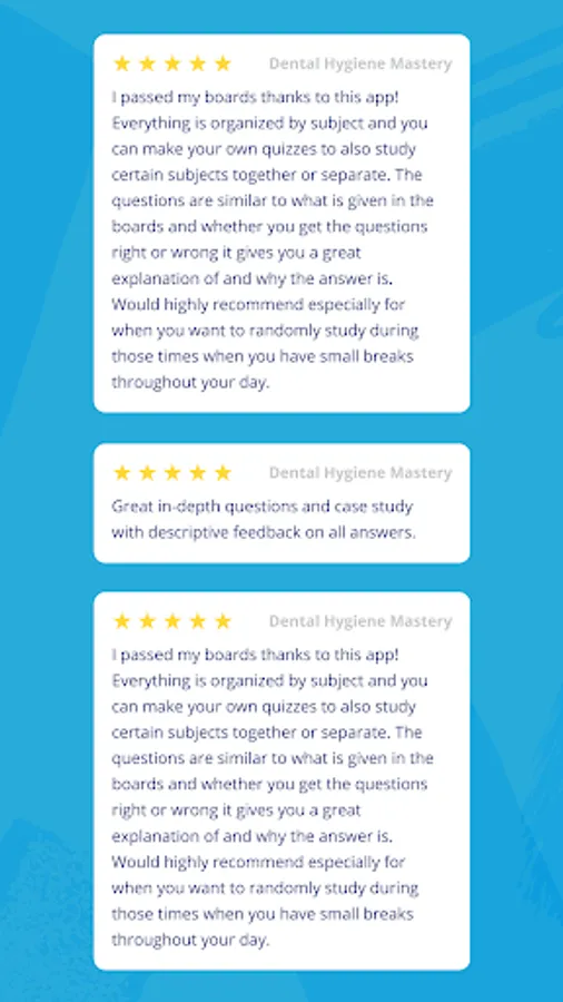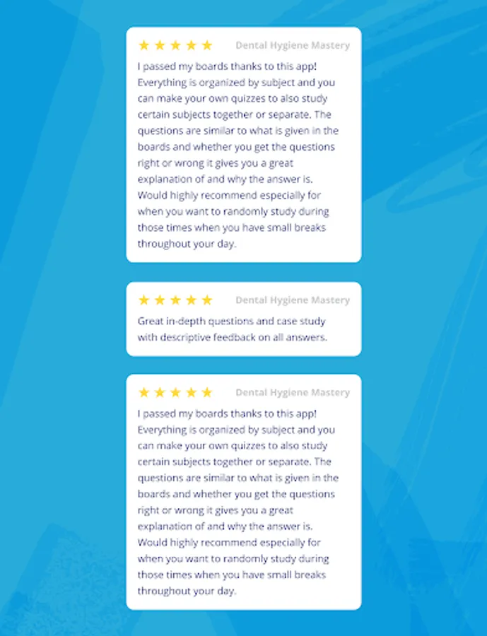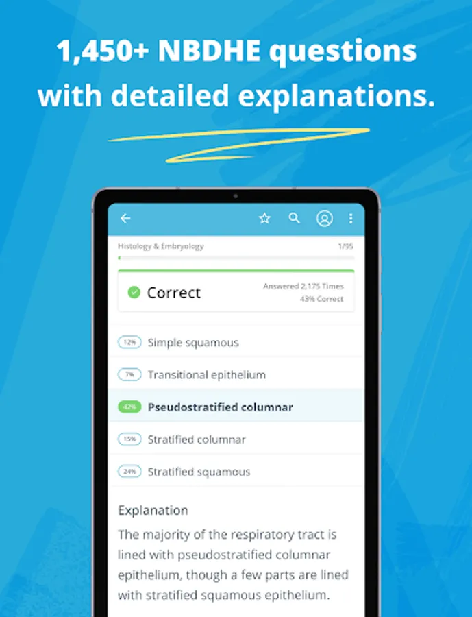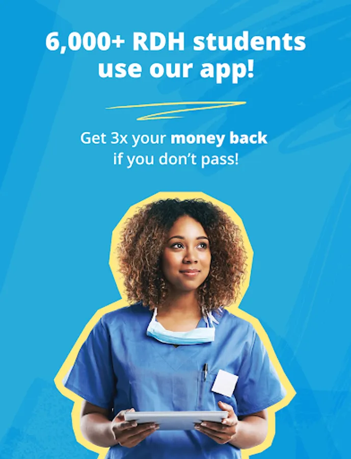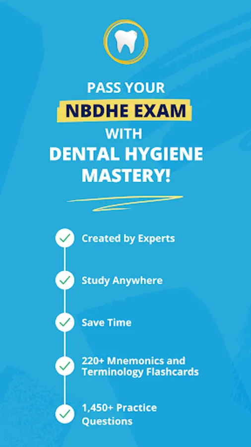 Download Dental Hygiene Exam prep and access 1450+ practice questions, explanations, and detailed results tracking. With our Dental Hygiene board review app, you will CRUSH the NBDHE exam!