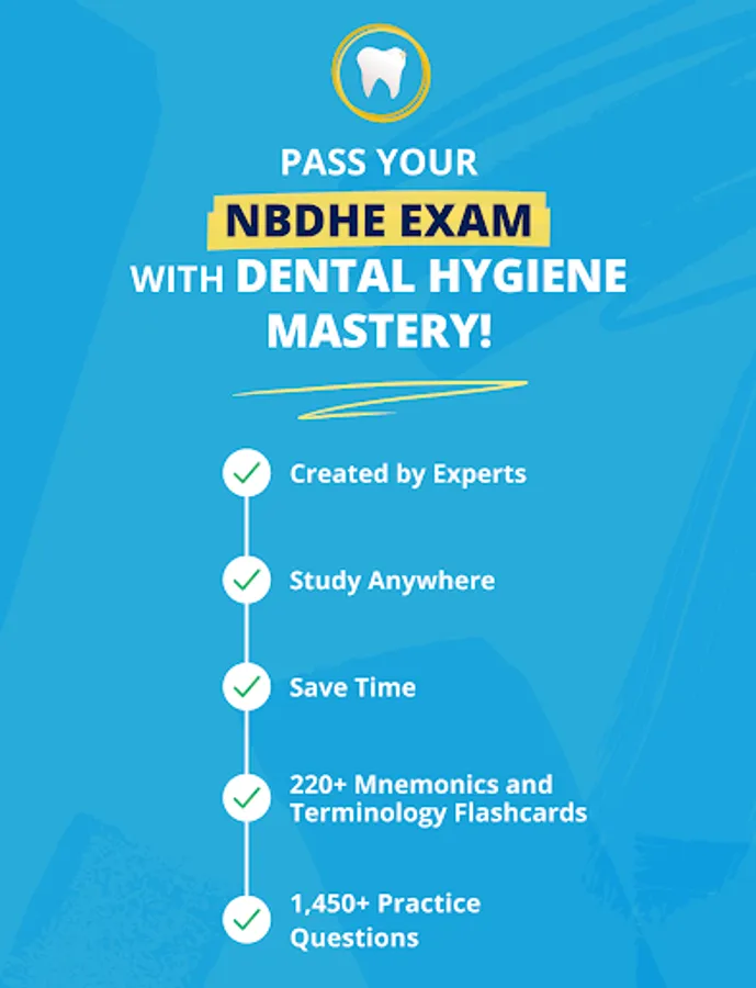 Download the Dental Hygiene Board review app and check why our learning app is easy to use! Study to pass NBDHE Exam and test your knowledge with our practice questions. Study ANYTIME, ANYWHERE! Build your confidence and pass the real exam the 1st time!
