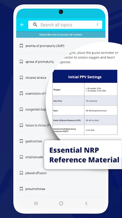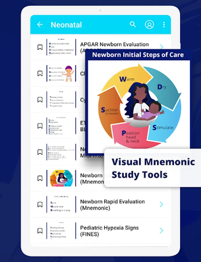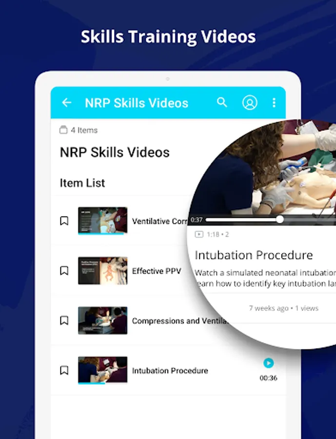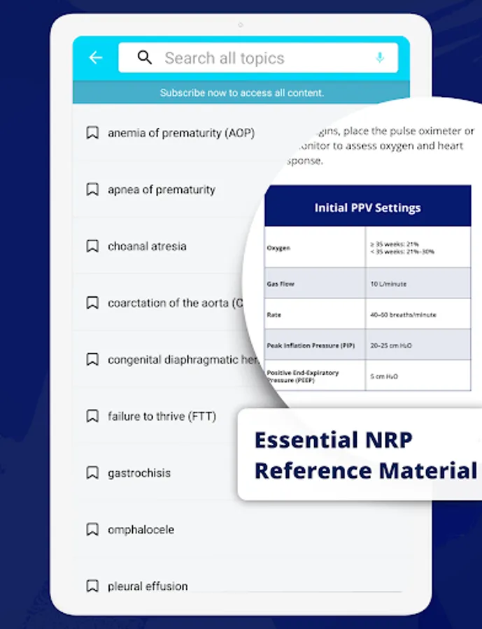 • Essential reference materials, including neonatal resuscitation guidelines, skills topics, intrapartum care topics, and NICU care topics.