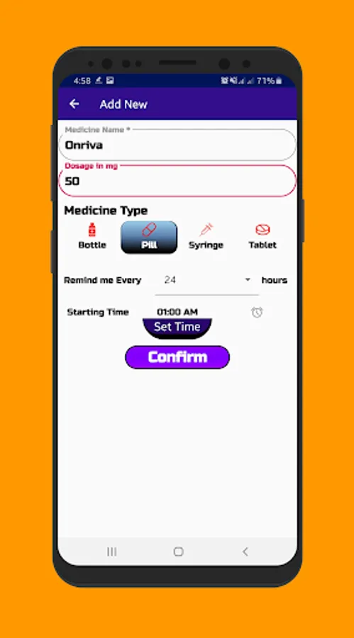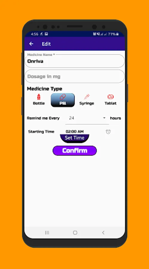 The name of the medicine in the app, you will decide how many hours to eat after, how much time you will eat at the first dose.