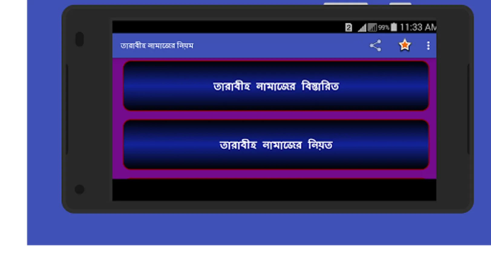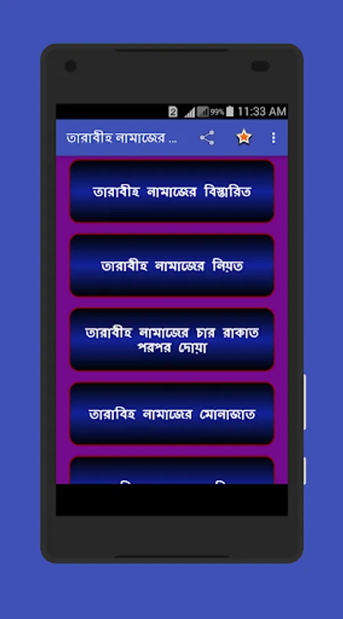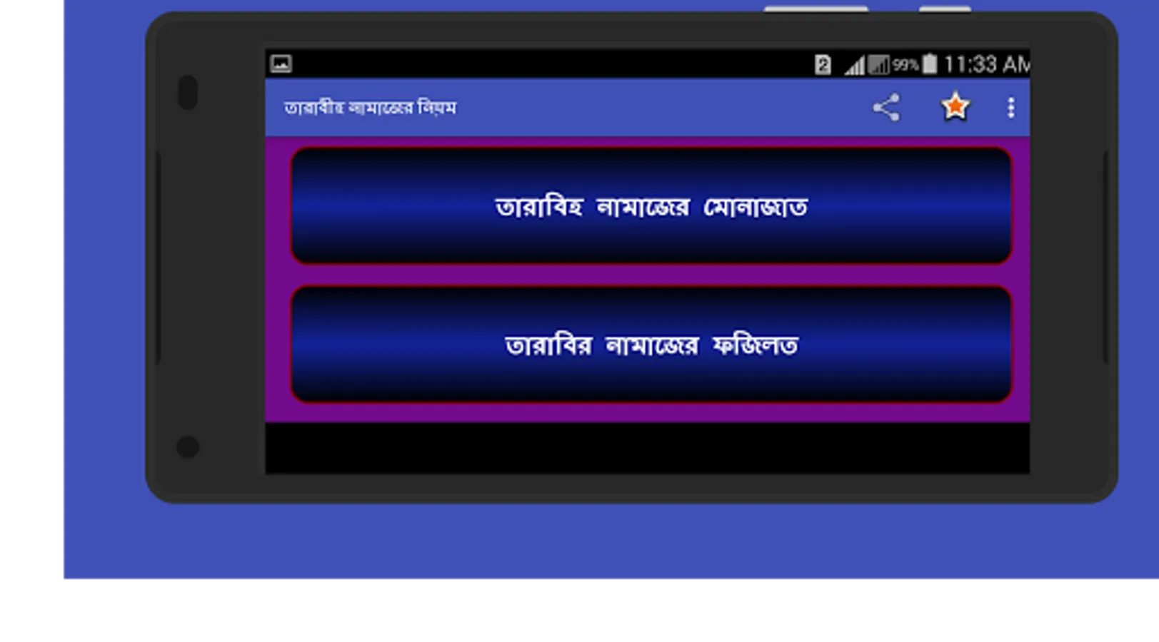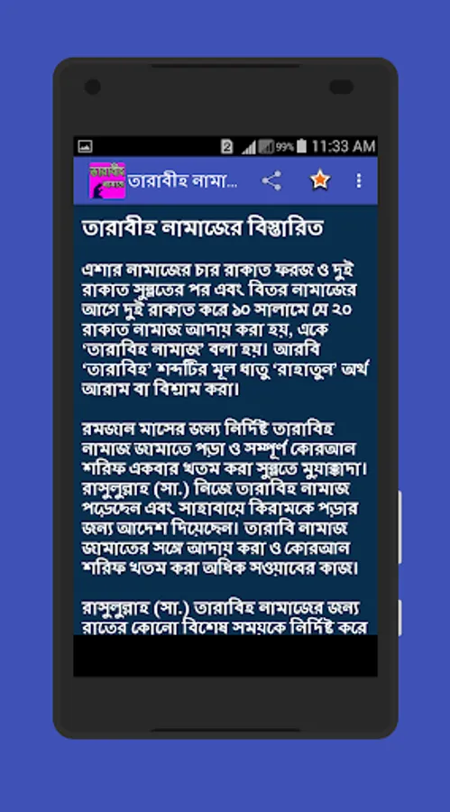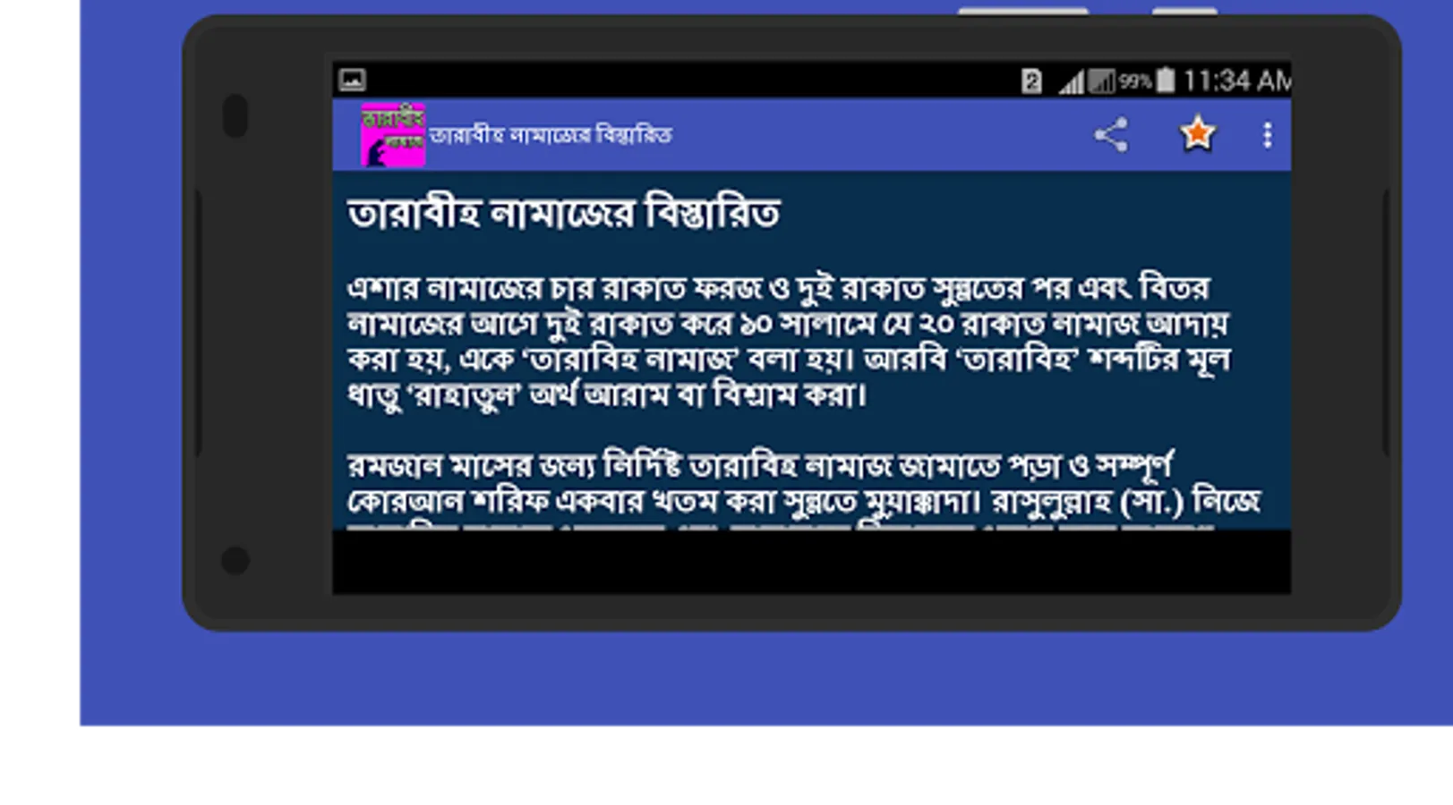 তারাবিহ নামাজ এই নামাজ শুধু মাত্র রমজান মাসে পড়ার কারণে আমরা অনেকেই এই নামাজের নিয়ত নিয়ম ও দোয়া ভুলে যাই শুধু তাই নয় এই নামাজের প্রতি ২ + ২ মানে ৪ রাকাতের পর পর রয়েছে একটি দোয়া যা আমরা অনেকে পড়তে পারি না তাই সকল মুসলমান ভাইদের রমজান মাসের কথা মাথায় রেখে আমরা তৈরি করছি তারাবীহ নামাজের খুটি নাটি সব বিষয়ের উপর একটি ইসলামিক অ্যাপ।