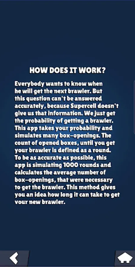 Everybody wants to know when he will get the next Brawl Stars Brawler. This question can't be answered exactly, because Supercell doesn't give us that information. We just get the probability for each Brawl Star Brawlers rarity. This app takes your probability and simulates many Brawl Box openings. The count of opened Brawl Boxes, until you get your Brawl Stars brawler is defined as round. To be as accurate as possible, this app is simulating 1000 rounds and calculates the average number of draws, that had been necessary to get the Brawl Stars brawler. This method gives you an idea how long it can take to get your new Brawl Stars brawler.