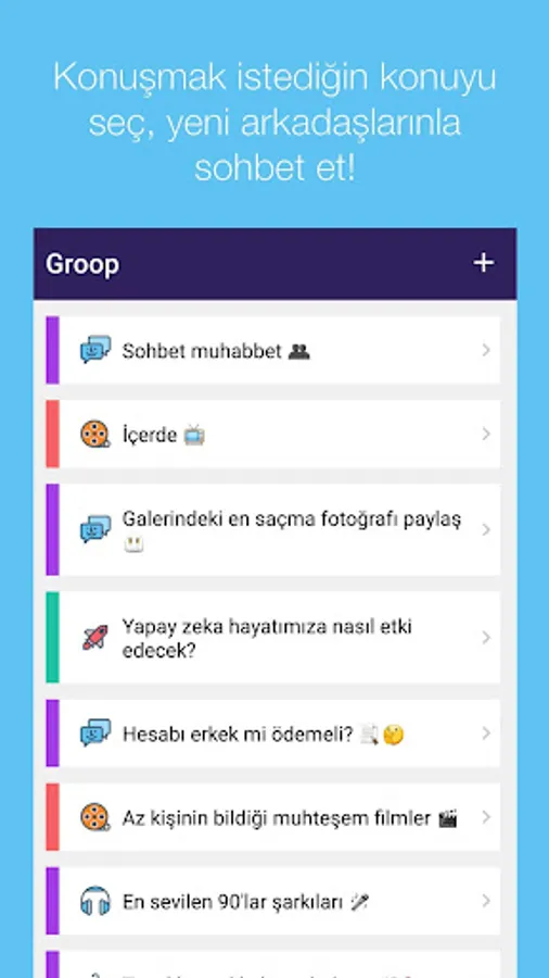 Konuşmak istediğin konuyu seç ve groop'undaki kişilerle bildiklerini paylaş, yeni şeyler öğren ve tartış!