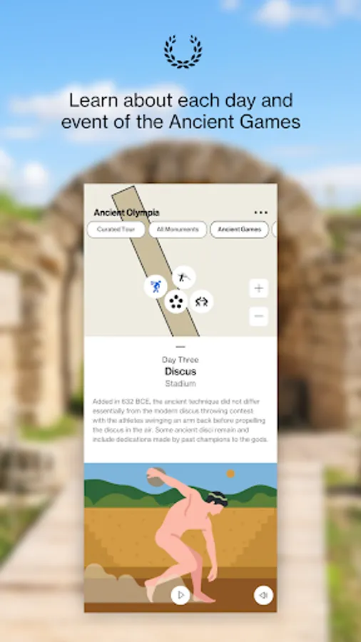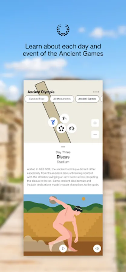 -Guided audio tour of the monuments of Ancient Olympia, available in Greek or English (note that this app is best experienced with the use of personal headphones) — available on-site at Olympia or anywhere in the world