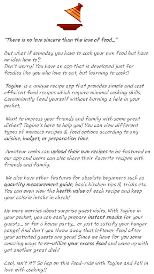 Tagine is a unique recipe app that provides simple and cost efficient food recipes which require minimal cooking skills.