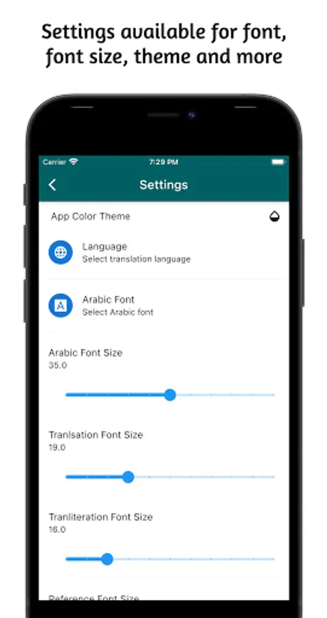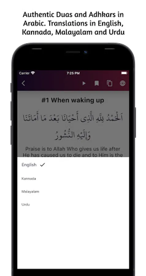 • Arabic with transliteration, English, Malayalam, Kannada and Urdu translations.