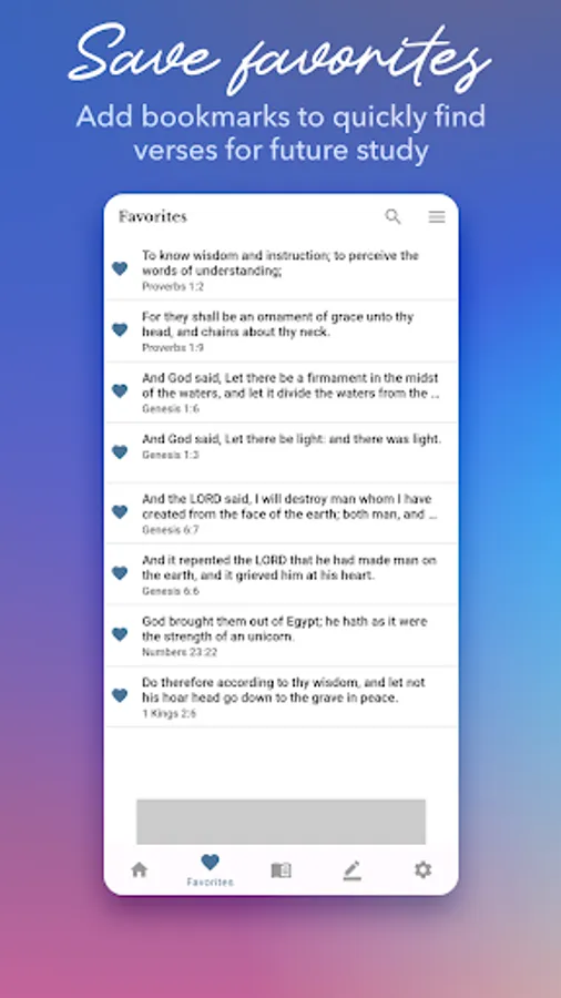 Use the favorites feature to save or bookmark your Bible study & quickly access where you left off. Get access to your favorite inspirational Bible verses whenever you need them!